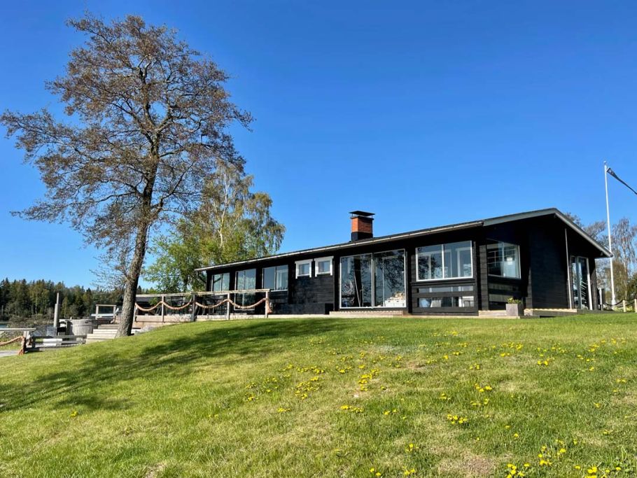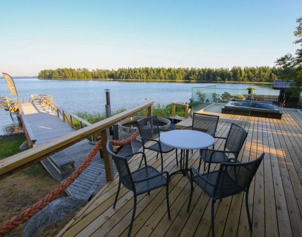 Terassilla on reilun kokoinen kaasugrilli, kala- ja lettupannu, liesi, korkea jääkaappi, palju, ulkoporeallas, uimalaiturit.
