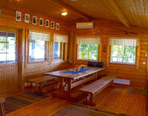 Takkahuoneessa on iso pirttipöytä, minikeittiö, kahvikeitin ja mikro sekä vuodesohva ja takka.